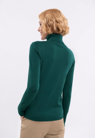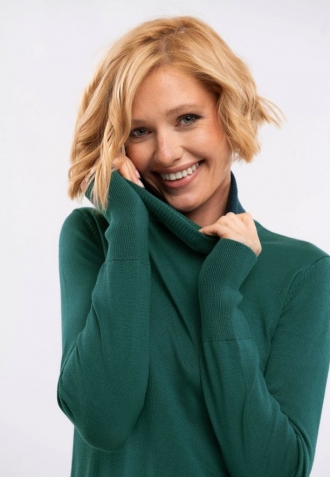 Zelený rolák má vypasovaný střih a zvýrazňuje siluetu. Rukávy jsou zakončeny širokými žebrovanými manžetami. Celý střih je jednoduchý, elegantní a doplněný bižuterním detailem Volcano.