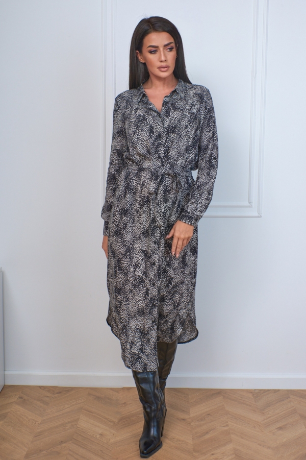 Model: ROSE Barva: černá, béžová Střih: košilový Délka: polodlouhá Výstřih: s límečkem Rukáv: dlouhý Zapínání: knoflíky Materiál: 100% viskóza