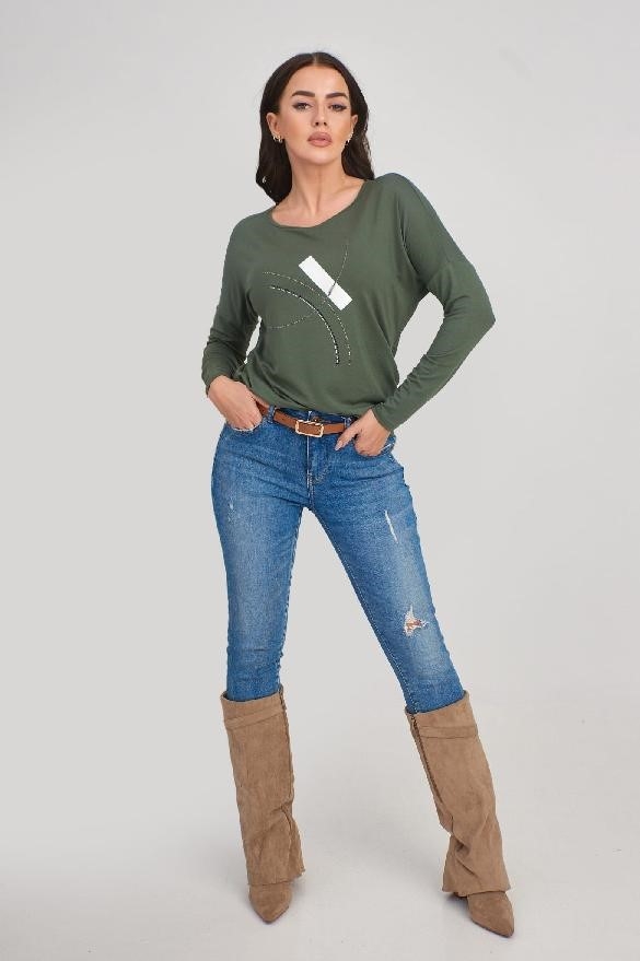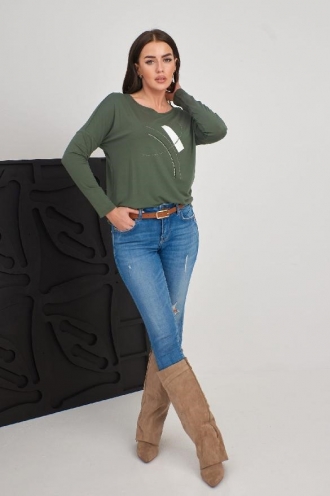 Model: SALOME Střih: regular fit Barva: olivová Vzor: s potiskem a kamínky Výstřih: kulatý Materiál: 95 % bavlna, 5 % elastan