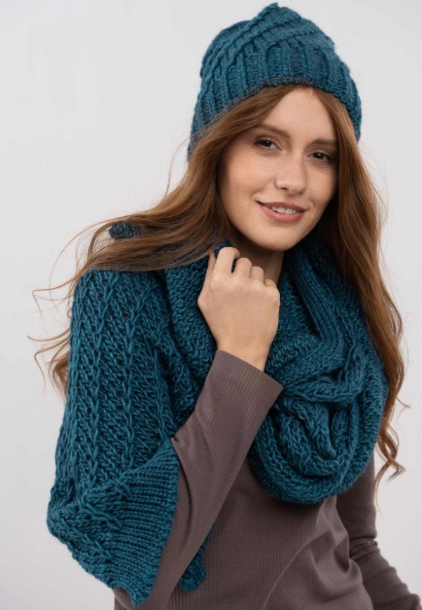 Tyrkysová vlněná čepice H-BIU je v sadě se šálou H-LEVI ve stejné barvě.