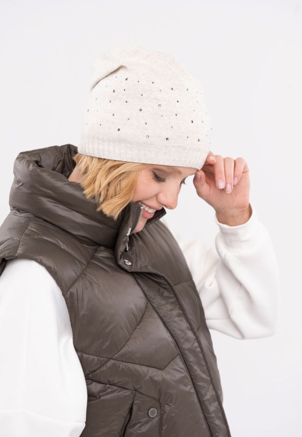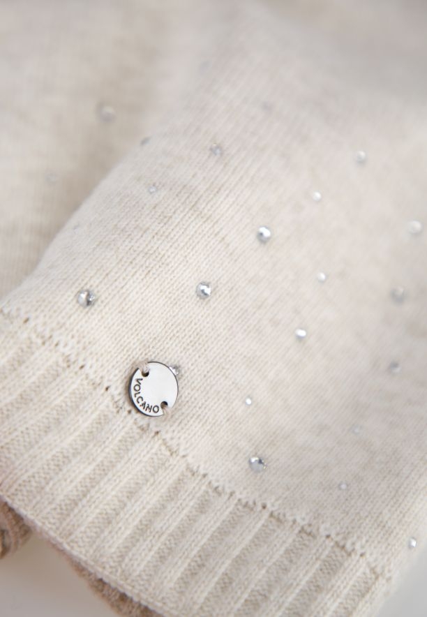 Dámská zimní čepice H-DIXIE je ušitá z pružného a měkkého úpletu, díky kterému se snadno nosí na hlavě. Dvojitý úplet poskytuje teplo a krémová barva je univerzální a hodí se ke všem stylům. Dámská zimní čepice je mírně prodloužená a vzadu prošitá, což jí dodává originální tvar a pěkně sedí na hlavě. Přiléhavé nošení zajišťuje pružný „svetrový“ lem ve spodní části čepice. Čepici zdobí krystaly a kovový štítek Volcano umístěný na přední straně čepice.