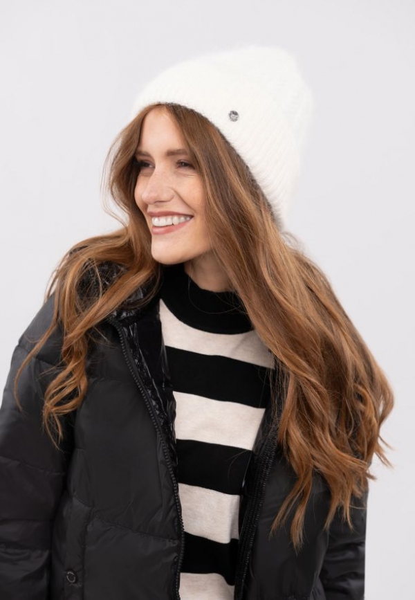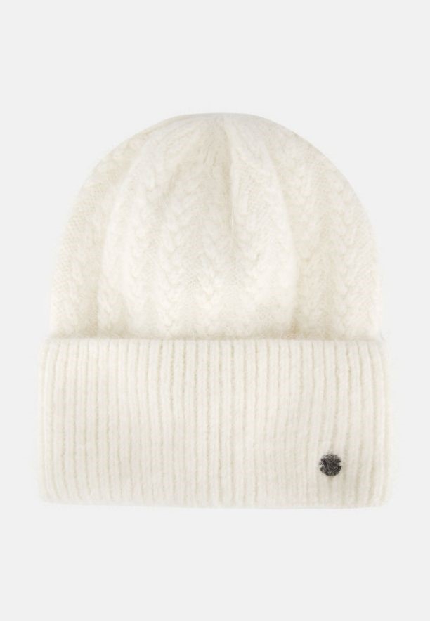 Klasická dámská zimní čepice vyrobená ze směsi angorské vlny a polyesterových vláken v poměru 60/40. Díky použití 60 % angory ve složení je čepice výjimečně teplá a příjemná na dotek. Přídavek syntetických vláken zajišťuje její odolnost a pružnost. Dámská čepice v krémové barvě má ozdobnou pletenou vazbu a ohrnovací okraj, takže si ji můžete přizpůsobit svým potřebám. To, co odlišuje tuto hřejivou čepici na zimu, je charakteristické angorské pozlátko, které dodává dámské čepici H-ALPE originální a útulný vzhled.