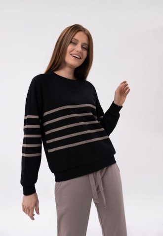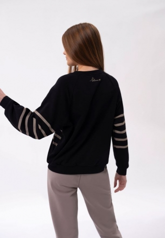 Černá pruhovaná dámská mikina je ušitá z měkké a odolné teplákoviny. Mikina se smyčkami zespodu zaručuje prodyšnost a zároveň hřejivost, díky čemuž je mikina ideální pro každodenní nošení. Díky volnému střihu a raglánovým rukávům poskytuje tato módní dámská mikina plný komfort pohybu. Díky kulatému výstřihu a žebrovaným manžetám dámská mikina B-MUSE perfektně sedí na těle.