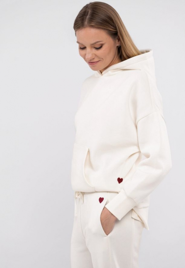 Dámská mikina B-LOVE vyniká především motivem srdíček. Ta jsou hlavním ozdobným prvkem mikiny. Vyšívané srdce s nápisem Volcano najdete na prostorné mikině. Jedno srdce bylo umístěno také na boku této bílé mikiny. Mikina je zakončena volným širokým lemem a má našitou klokaní kapsu, do které si můžete pohodlně uložit ruce.