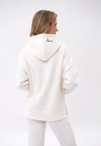 B-LOVE je dámská mikina s oversize střihem. Tato módní mikina je v krásné bílé barvě a zespodu má nadýchaný povrch. Díky tomu je hřejivá a příjemná na dotek. Je vyrobena z bavlny s polyesterem, takže poskytuje pohodlí a v kombinaci se sníženou linií ramen také volnost pohybu.
