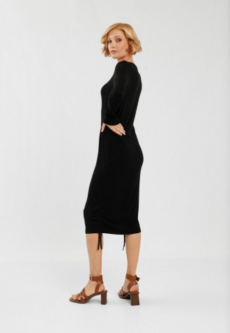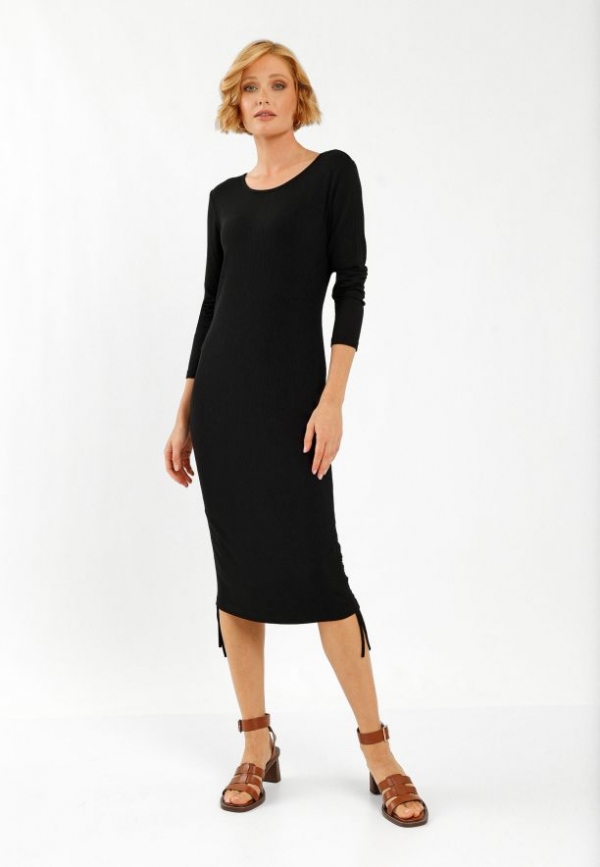 Tyto elegantní černé šaty jsou ideální volbou pro ženy, které oceňují minimalismus a promyšlený šatník. Šaty lze totiž nosit dvěma způsoby, od malých černých až po elegantnější maxi šaty. Je to díky páskům všitým do boků, které umožňují upravit délku. Jsou vyrobeny z pružného, měkkého úpletu, dokonale se přizpůsobí postavě a zdůrazní její přednosti. Šaty se vyznačují svislými úzkými pruhy, které opticky zeštíhlují postavu. Polokulatý výstřih, volné manžety a spodní lem jim dodávají lehce ležérní charakter, který se skvěle hodí pro každodenní nošení i pro zvláštní příležitosti.