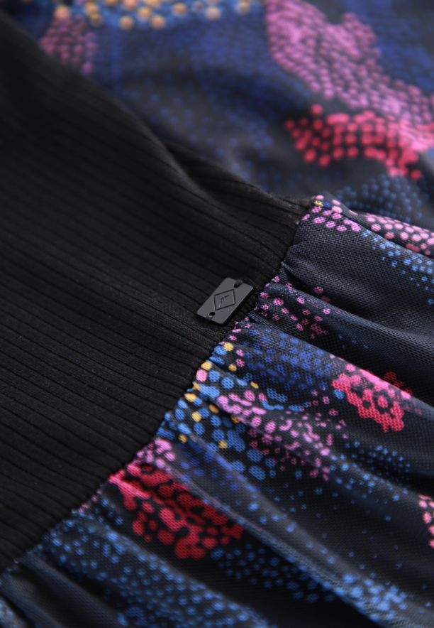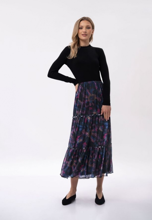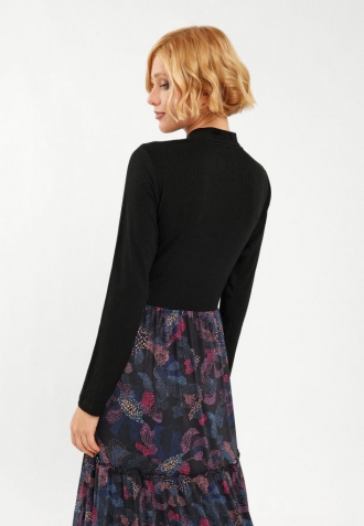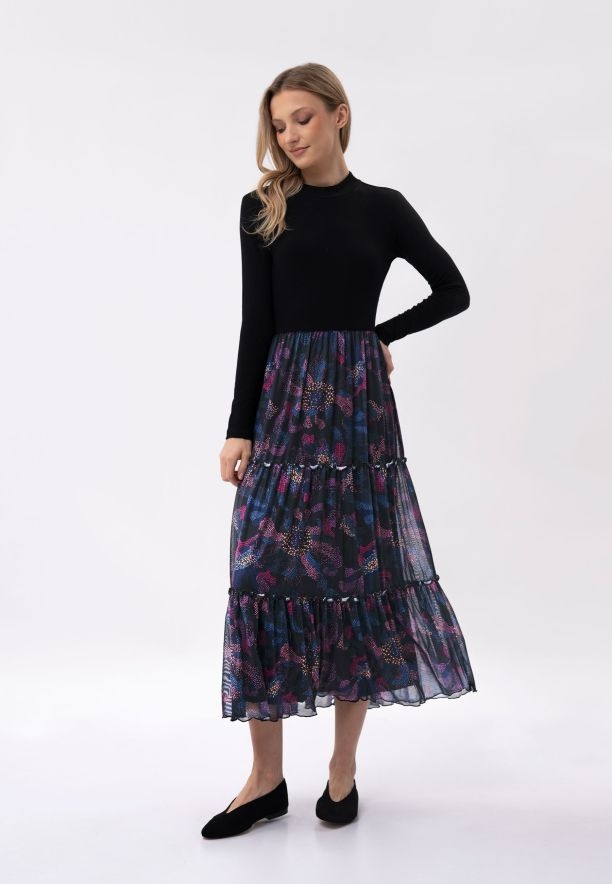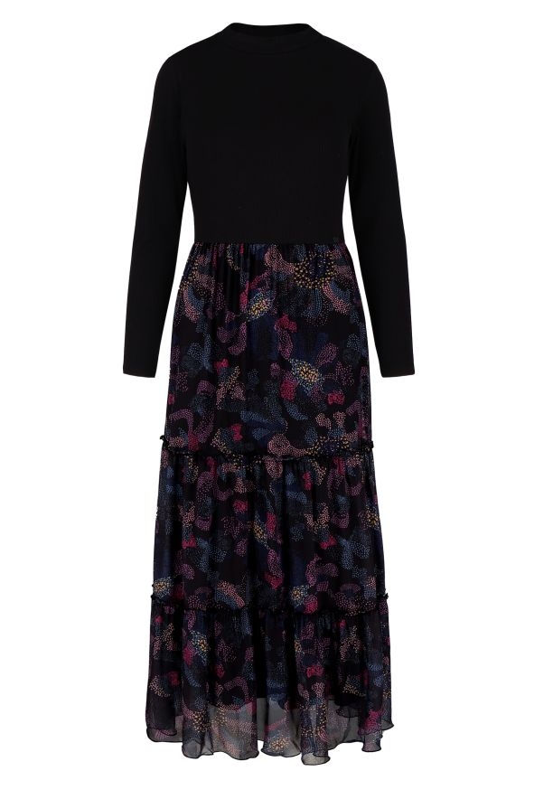 Maxi šaty vynikají černým horním dílem a barevným, ale tlumeným spodním dílem. Vysoký výstřih zakončený žebrovaným lemem a elastické manžety bez švů zajišťují pohodlí, zatímco díky vzdušnému šifonovému spodnímu dílu s volánky vypadají skvěle na cestách.