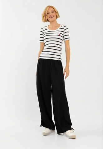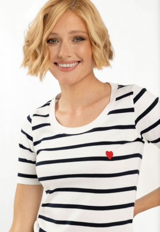 Hledáte trendy pruhované tričko? Vyberte si dámské tričko T-VALENTINE. Je vyrobeno z žebrované, pružné tkaniny, která se dokonale přizpůsobí siluetě a zajistí celodenní pohodlí. Střih Slim Fit zdůrazňuje ženské křivky, zatímco pruhovaný vzor působí módním, ležérním dojmem. Kulatý výstřih a krátké přiléhavé rukávy mu dodávají univerzálnost, takže se skvěle hodí pro každodenní stylizaci ke kalhotám i sukním.