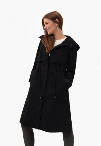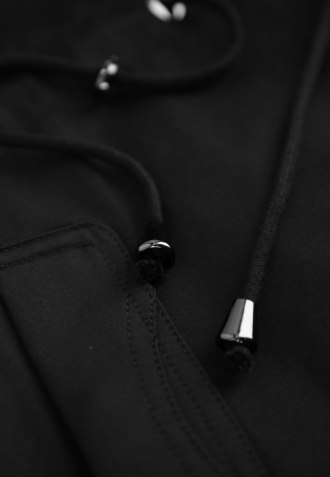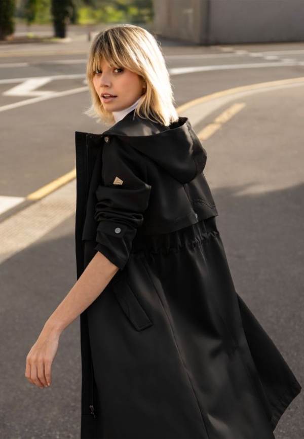 J-BJORK je pohodlnou kombinací dlouhého kabátu a trenčkot. Černá barva odkazuje na klasické trenčkoty, stahovací šňůrky v pase zase využívají praktické prvky bundy. Kabát tak dokonale tvaruje siluetu a kapuce s popruhy poskytuje dodatečnou ochranu proti větru a dešti. Volné manžety, které jsou nastavitelné pomocí všitého pásku se dvěma knoflíky, umožňují upravit rukávy podle individuálních preferencí.