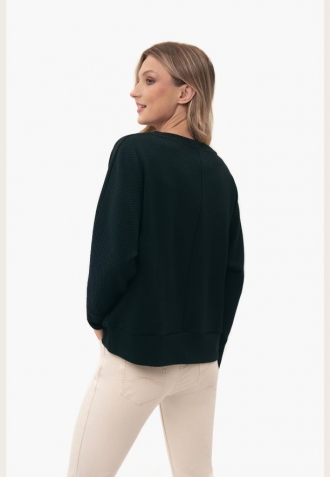 Dámská mikina v zelené barvě má volný střih. Snížená linie ramen a kimonové rukávy podtrhují ležérní styl, zatímco široký spodní lem dodává mikině módní tvar. Půlkruhový výstřih s překrývajícím se žebrováním je decentním ozdobným prvkem, který model odlišuje od klasických mikin.