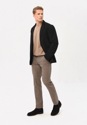 Sako ve sportovním stylu je dokonalou kombinací elegance a pohodlí. Je vyrobeno z měkkého a na dotek příjemného úpletu a zaručuje volnost pohybu, takže je ideální pro každodenní styling. Regular fit střih zvýrazňuje siluetu, aniž by omezoval pohyb. Sako má zapínání na dva knoflíky a klasické rovné klopy pro nadčasový vzhled.
