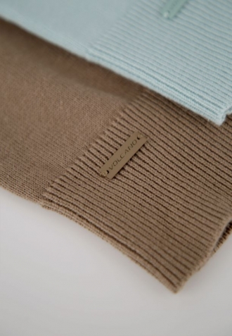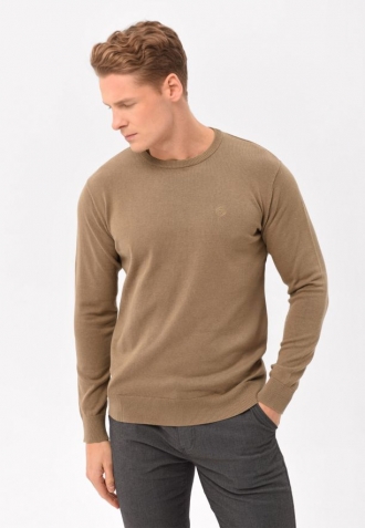 Svetr S-RADO má béžovou barvu a je hladký. Jednoduchý design je zpestřen vyšitým detailem loga značky na levé straně.