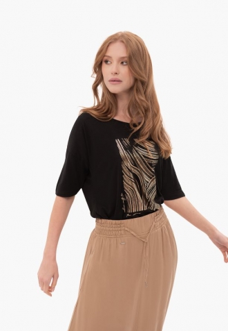 Tričko oversize v černé barvě se vyznačuje sníženou linií ramen a půlkruhovým výstřihem, který zdůrazňuje krk. Abstraktní potisk na hrudi, dodává umělecký nádech. Jedná se o model, který se bude dobře hodit k džínům, šortkám nebo sukním, čímž vytvoří ležérní a moderní styling. Ideální volba pro ženy, které ocení pohodlí a originální detaily.