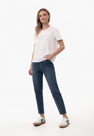 Tričko T-MOMENTS má na hrudi lesklý potisk, který na sebe upozorňuje a zdůrazňuje jeho charakter. Díky krátkým rukávům a volnému rovnému lemu se hodí k různým stylům od džínů po sukně. Doplňkem je ozdobná stuha na vnitřní straně límce, která zdůrazňuje smysl pro detail. Je ideální volbou pro ženy, které ocení pohodlí a nadčasový styl s nádechem půvabu.