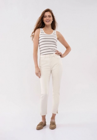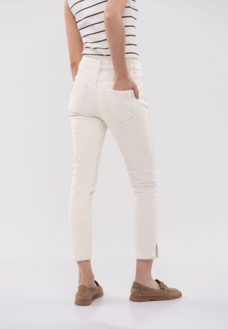 Dámské džíny D-BLU jsou vypasovaný model Slim Cropped. Spodní část nohavic o délce ⅞ má diagonální prošití s krátkým rozparkem, díky kterému kalhoty vypadají velmi originálně a zeštíhlují nohy. Džíny krémové barvy mají regular střih a jsou vypasované v pase a v linii boků a stehen. Dvě trojúhelníkové kapsy na zadní straně opticky tvarují postavu a hýždě.
