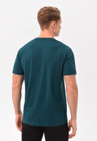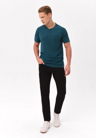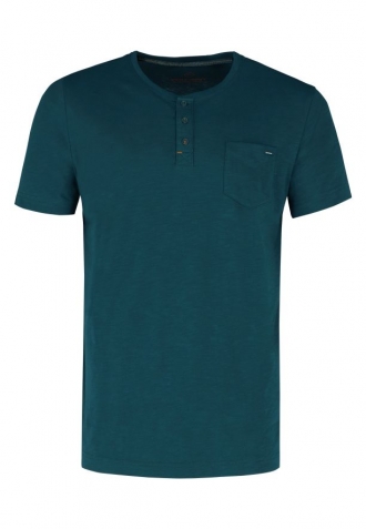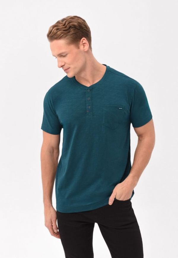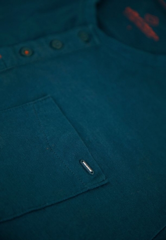 Tyrkysové tričko T-HUBRIS má klasický, mírně volnější a volnost pohybu poskytující střih a výstřih na knoflíčky. Má také kapsičku na levé straně hrudi, která je zdobená detailem Volcano. Tričko je vyrobeno s velkým důrazem na detail. Vnitřní část límce i výstřih se zapínáním na knoflíky jsou zdobeny originální páskou. Spodní část a rukávy byly navíc zpevněny dvojitým prošitím a výstřih tenkým žebrováním.