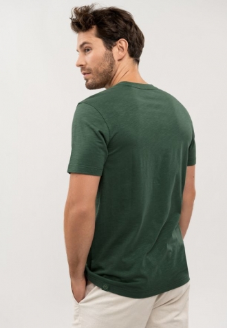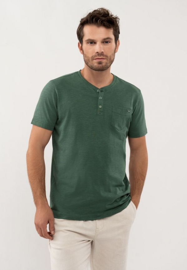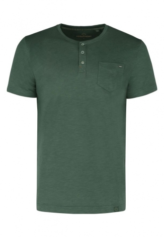 Zelené tričko T-HUBRIS má klasický, mírně volnější a volnost pohybu poskytující střih a výstřih na knoflíčky. Má také kapsičku na levé straně hrudi, která je zdobená detailem Volcano. Tričko je vyrobeno s velkým důrazem na detail. Vnitřní část límce i výstřih se zapínáním na knoflíky jsou zdobeny originální páskou. Spodní část a rukávy byly navíc zpevněny dvojitým prošitím a výstřih tenkým žebrováním.