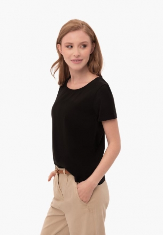 T-ANA je nadčasové základní dámské tričko. Jeho design je definicí minimalismu a pohodlí. Je vyrobeno z elastické bavlny o gramáži 200 g/m2, je odolné a příjemné na dotek. Střih Regular Fit zvýrazňuje siluetu, ale pevně ji nerámuje a nabízí každodenní pohodlí. Dámské tričko bez potisku má půlkulatý výstřih zpevněný žebrovaným lemem, který dodává klasický vzhled a zabraňuje zkreslení. Díky krátkému rukávu je tričko skvělou volbou pro teplejší dny a jeho univerzální černá barva se bude snadno hodit ke každé stylizaci - od ležérní až po elegantnější. Dokonalý základ každého šatníku!