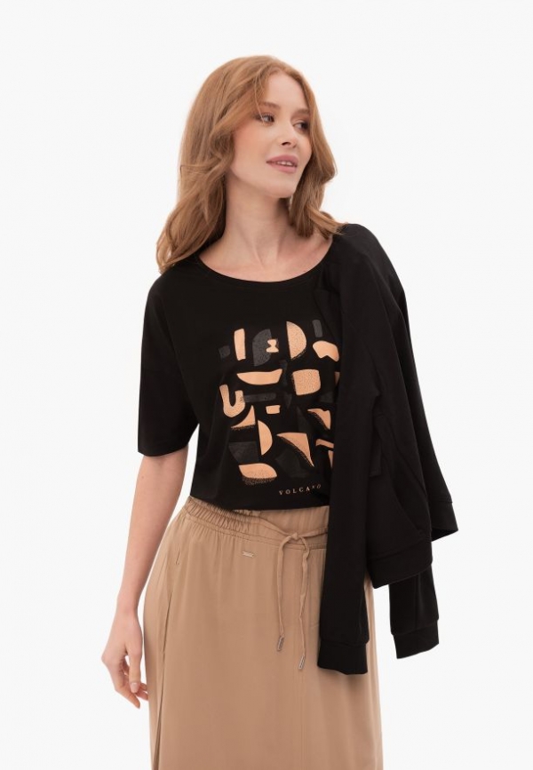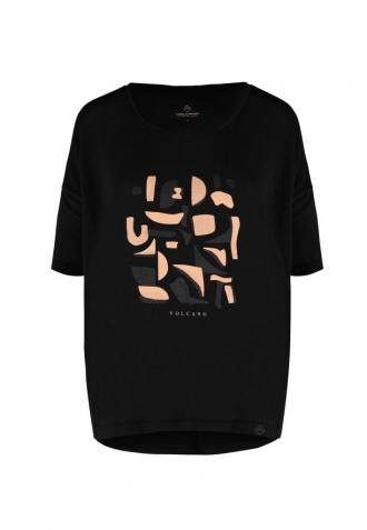 Dámské tričko pohodlného střihu má černou barvu a abstraktní potisk na hrudi, který dodává tomuto dámskému tričku jedinečný charakter.