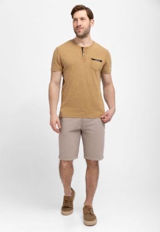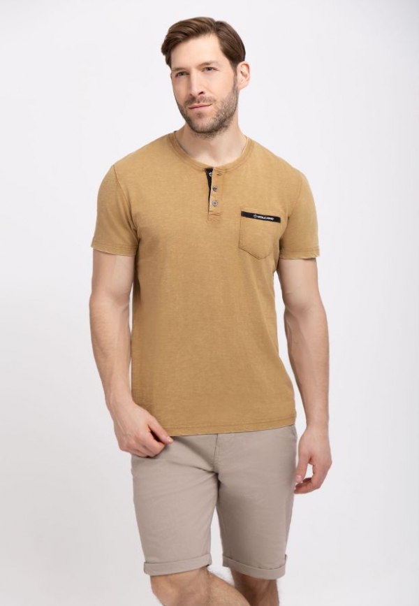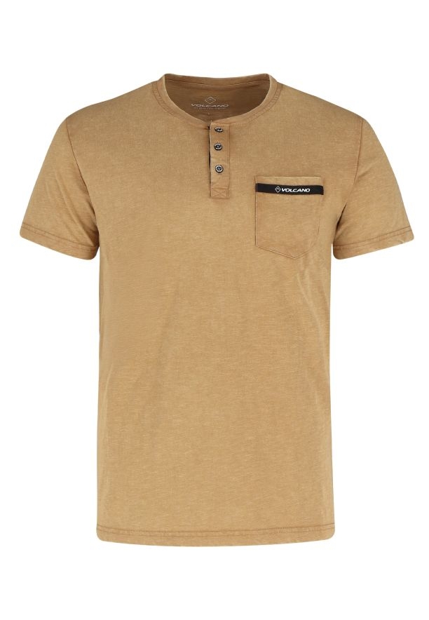 Pokud jste příznivci polokošil, ale nemáte rádi klasické vyztužené límečky, určitě si prohlédněte naše nové pánské tričko T-APY. Má zapínání na tři knoflíky a půlkruhový výstřih s žebrováním (tzv. henley výstřih). Výrazný knoflíkový výstřih jí dodává osobitý styl, zatímco náprsní kapsa s kontrastním lemováním a decentním logem Volcano jí dodává originální nádech. Za zmínku stojí, že použití knoflíků umožňuje měnit charakter výstřihu. Jejich rozepnutím se dosáhne výstřihu s o něco menším úhlem než u standardních košil s výstřihem do V.