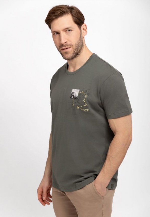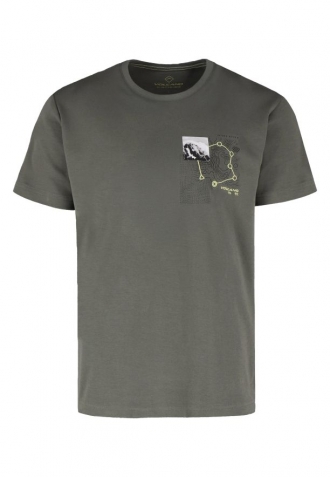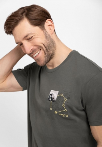 Pánské tričko T-MAP je tričko v khaki barvě v basic stylu, které je prolomeno malým, ale velmi zajímavým potiskem. Na místo kapsy na hrudi naši grafici umístili potisk hypsometrické mapy a hor. Celek je ozvláštněn oranžovou výšivkou a jistě osloví milovníky horských túr.
