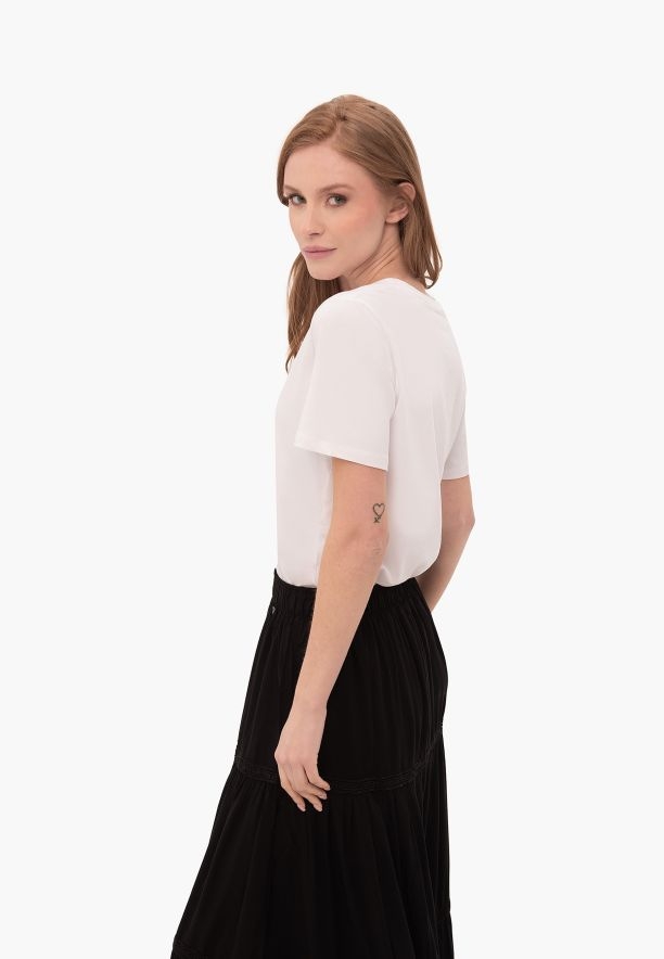 Dámské tričko T-LEA má originální V-výstřih, který je pro zpevnění zakončen širokým lemem. Díky tomu halenka dokonale padne pod krk. Dámské tričko je vyrobeno z přírodního materiálu, který umožňuje pokožce dýchat. Z 95 % se jedná o silnou bavlnu, díky níž je tričko masivnější na dotek. Dobře padnoucí střih zajišťuje 5 % elastanu.