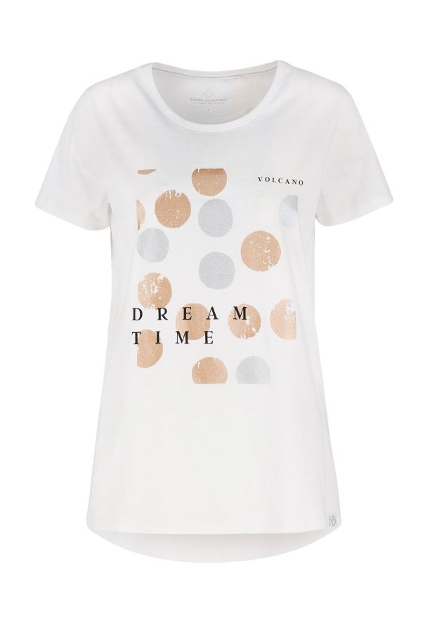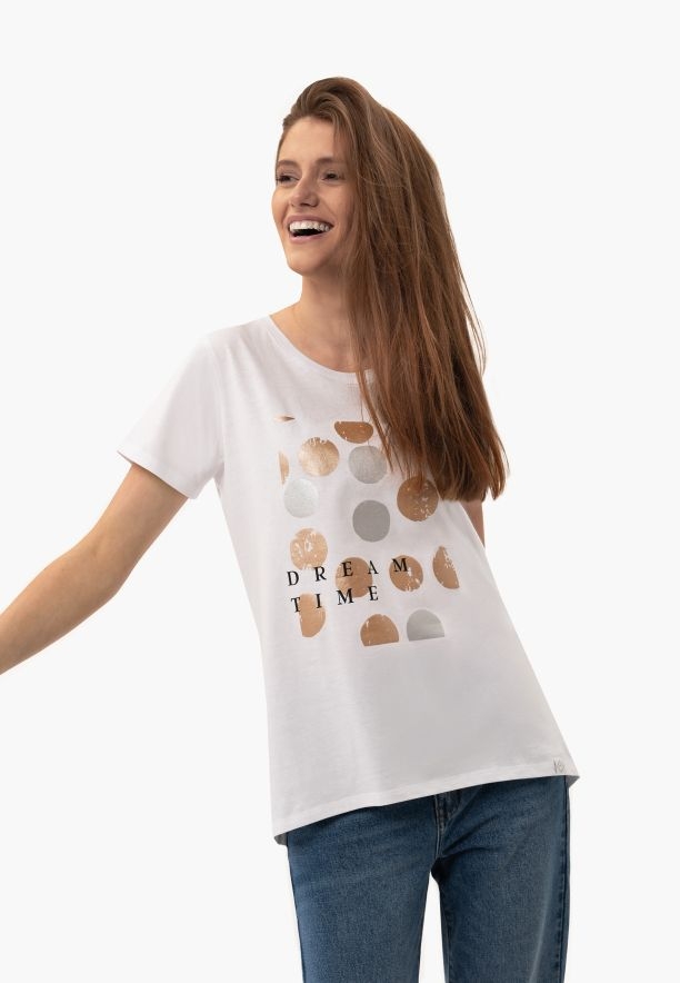 Dámské tričko má na hrudi potisk ve stylu glamour. Ozdobné potisky v podobě kruhů v odstínech zlaté a stříbrné a nápis „DREAM TIME“ upoutají pozornost a dodávají halence originální charakter. Jemné, lesklé prvky jí dodávají trochu elegance, díky čemuž můžete tričko T-NETTA kombinovat nejen s klasickými džínami, ale také s ženskými sukněmi. Univerzální bílá barva usnadňuje kombinování s různými stylizacemi: jak pro každodenní nošení, tak pro neformální setkání s přáteli.