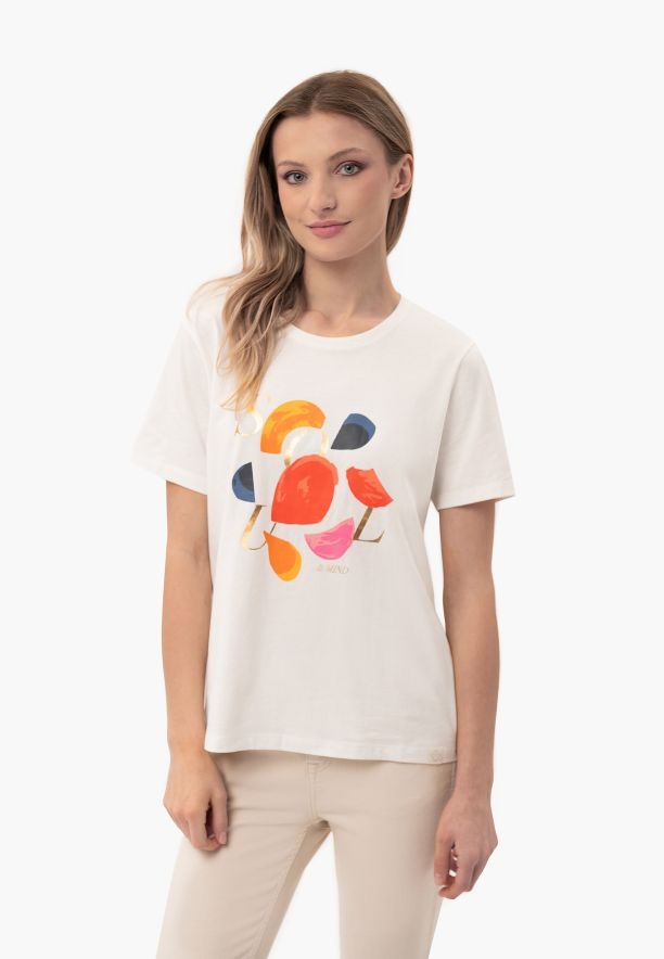 Co odlišuje tričko T-SOUL je barevný potisk na hrudi. Udržovaný v letních, zlatavě oranžových barvách se ideálně hodí ke krémové barvě, která tvoří základ tohoto dámského trička.