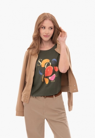 Co odlišuje tričko T-SOUL je barevný potisk na hrudi. Udržovaný v letních, zlatavě oranžových barvách se ideálně hodí k zelené barvě, která tvoří základ tohoto dámského trička.