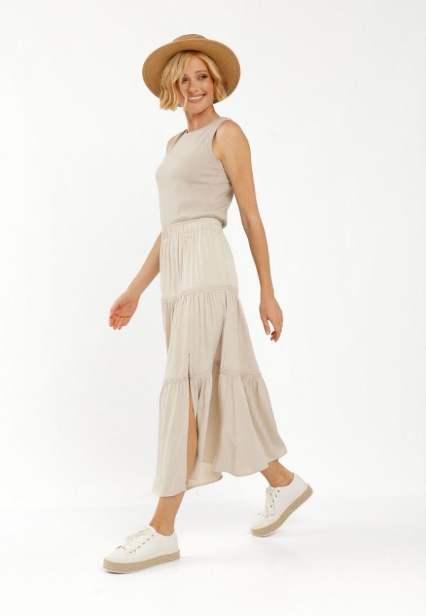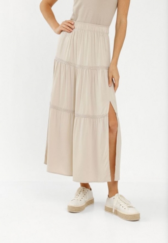Tato béžová dlouhá sukně je vyrobena ze 100% viskózy. Splývavý přírodní materiál zaručuje pohodlí a prodyšnost a umožňuje pokožce dýchat. Volný, rozšířený střih působí vzdušně a zdůrazňuje ženskou siluetu, zatímco maxi délka jí dodává eleganci. Sukně G-FLAVIA má pohodlný elastický pas pro lichotivý střih.