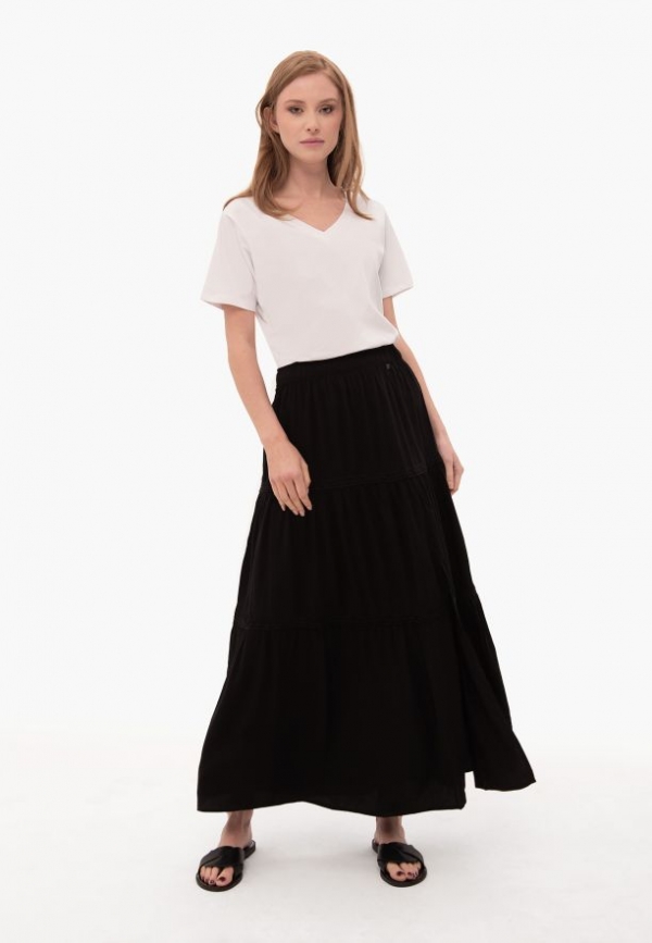 Tato černá dlouhá sukně je vyrobena ze 100% viskózy. Splývavý přírodní materiál zaručuje pohodlí a prodyšnost a umožňuje pokožce dýchat. Volný, rozšířený střih působí vzdušně a zdůrazňuje ženskou siluetu, zatímco maxi délka jí dodává eleganci. Sukně G-FLAVIA má pohodlný elastický pas pro lichotivý střih.