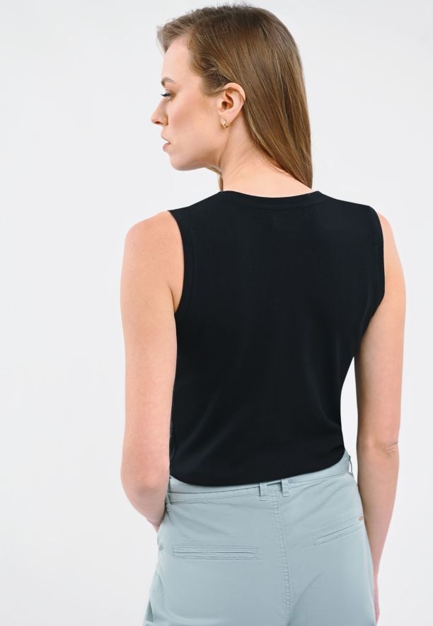Univerzální dámské tričko s širokými ramínky. Tričko je vyrobeno z módní žebrované tkaniny a má černou barvu. Díky střihu Slim Fit a jednobarevnému provedení lze tričko nosit buď samostatně, nebo pod sako, halenku či svetr.