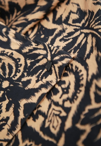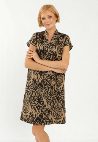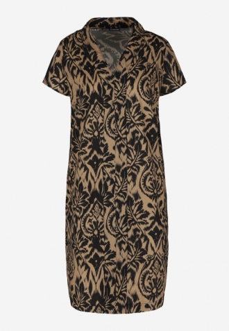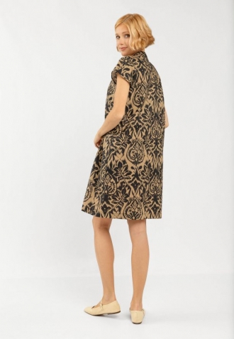 Světle hnědé šaty v odstínu moka s černým orientálním vzorem jsou ideální volbou na léto pro ženy. Jsou vyrobeny ze vzdušného materiálu, takže poskytují vynikající pohodlí v horkých dnech, zatímco jejich oversize střih zaručuje lehkost a volnost pohybu. Orientální vzor dodává šatům jedinečný charakter a vnáší do letních stylizací nádech exotiky.