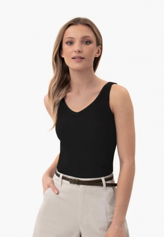 Tílko se přizpůsobí vaší postavě. Toto základní tílko je vyrobeno z měkkého úpletu - směsi prodyšné bavlny a elastanu, která materiálu dodává pružnost. Pružný materiál je velkou předností tohoto modelu. Dámské tílko se širokými ramínky se báječně přizpůsobí tělu a zdůrazní přednosti vaší postavy. Kromě toho má v-výstřih, který působí velmi žensky, a je olemován speciálním žebrováním, aby tyto prvky topu zpevnil.
