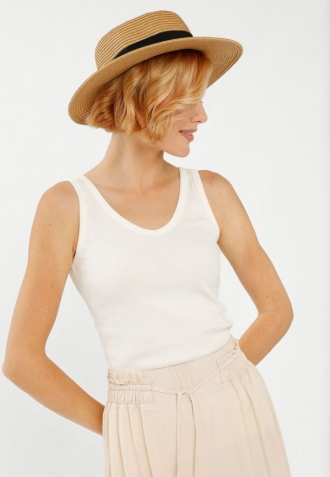Klasický dámský top v krémové barvě je ideálním základem pro mnoho outfitů. Je výrazný svým jednolitým odstínem a jemně žebrovanou strukturou. Je nadčasovým řešením, které rychle nevyjde z módy. Dámský top vypadá skvěle v létě s šortkami a také v zimě jako základ pod košili, svetr nebo kardigan.