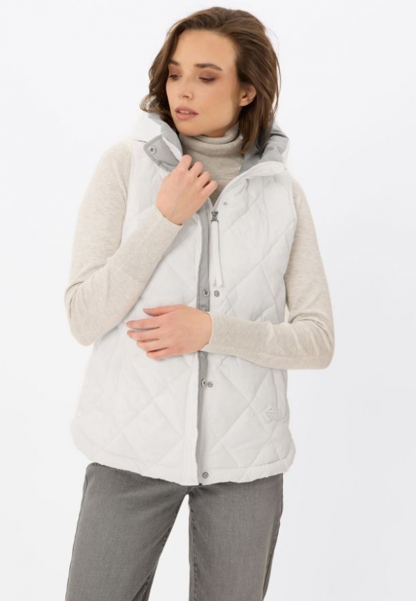 Prošívaná dámská vesta V-MILAN se skvěle osvědčí jako dodatečná vrstva oblečení v chladnějších dnech, jak na svetr, mikinu, tak i longsleeve. Kapuce dodává funkčnost, chrání před větrem a lehkým deštěm, a dvě praktické kapsy umožňují bezpečné uložení drobných předmětů. Neutrální, bílá barva způsobuje, že vesta se snadno začlení do vašeho šatníku.