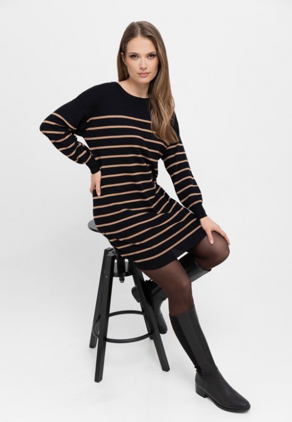 Pletené šaty G-SENTI se stanou vaší oblíbenou každodenní volbou, zajišťující příjemné obepnutí v chladnějších dnech. Charakteristickým rysem těchto šatů je nadčasový vzor s klasickými vodorovnými pruhy. Tento námořnický akcent jim dodává svěžest a eleganci, která nikdy nevyjde z módy. Volný střih s dlouhým rukávem a kulatým výstřihem zajišťuje komfort a univerzálnost, a pletenina obepíná tělo, což dává pocit útulnosti.