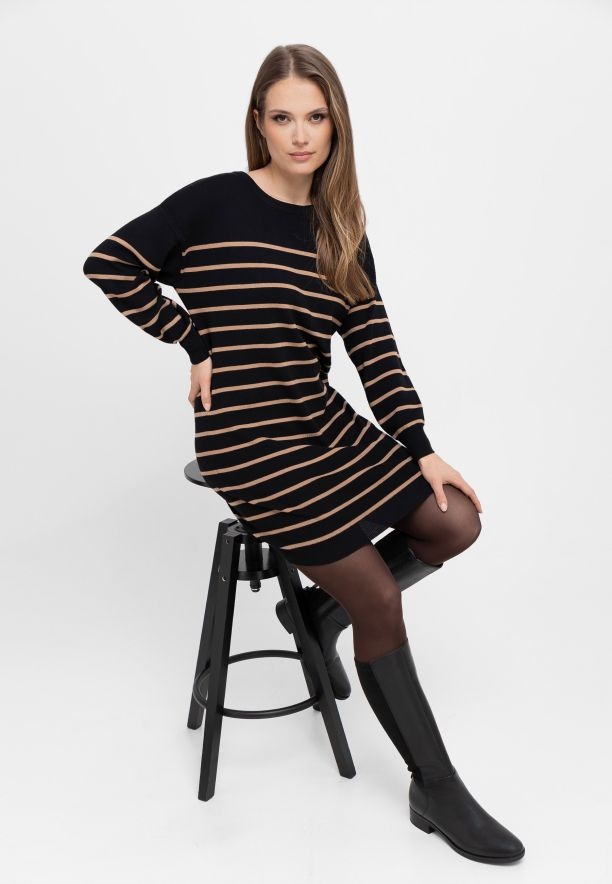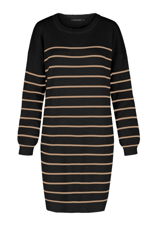 Teplé, černé šaty s pruhy jsou vyrobeny z příjemné na dotek směsi viskózy a polyamidu. Díky obsahu viskózy je materiál výjimečně měkký, hedvábný na dotek a krásně se ukládá, decentně obepínajíc postavu a zároveň zajišťujíc vynikající prodyšnost. Přídavek polyamidu zase zaručuje trvanlivost, odolnost proti mačkání a skvělé udržení střihu i po mnoha praních. Tyto pletené šaty jsou vynikající volbou pro chladnější dny, ideální pro nošení samostatně s kotníčkovými botami nebo teniskami, a také jako základ pod svetr, kardigan nebo ramonesku. Vytvořte s nimi nespočet stylových a pohodlných stylizací, užívajíc si jejich útulný charakter!