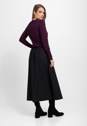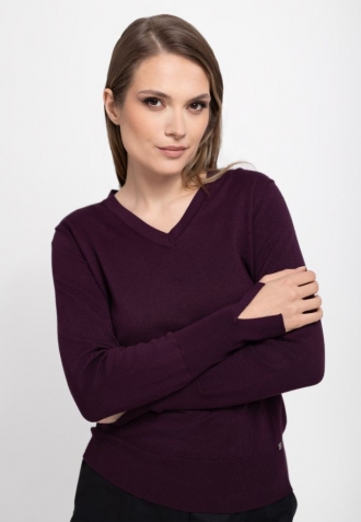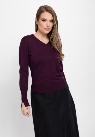 Svetr S-NELI, vyrobený z hladkého úpletu, zaujme jednoduchým, ale zároveň stylovým designem. Jeho přiléhavý střih Slim Fit podtrhuje ženské tvary a výstřih do V mu dodává jemnost a ženský šarm. Zakončení na manžetách a spodním lemu širokými žebrovanými manžetami zajišťuje nejen dokonalé přizpůsobení, ale také odolnost, díky čemuž se z něj budete těšit mnoho sezón. Je třeba zdůraznit, že manžety mají jemné, ozdobné rozparky a vínový svetr s výstřihem do V je k dispozici také ve velkých velikostech.