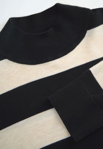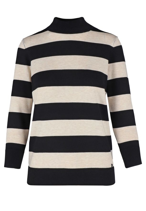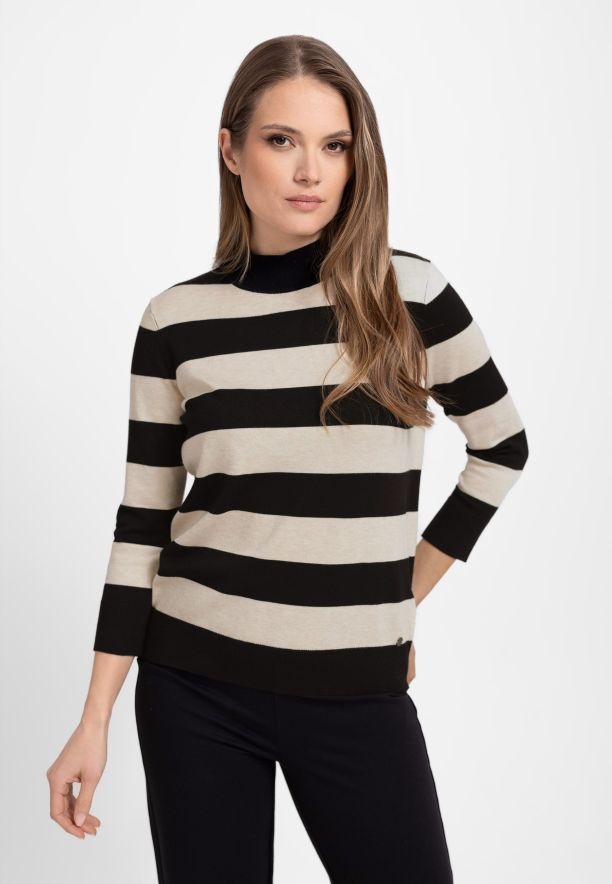 Vlastností odlišující svetr S-TESS jsou široké béžovo - černé pruhy. Široké, žebrované lemy u manžet a na spodním lemu mu nejen dodávají charakter, ale také zajišťují dokonalé přizpůsobení a trvanlivost. A klasický střih způsobuje, že bude sedět na každou postavu.