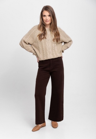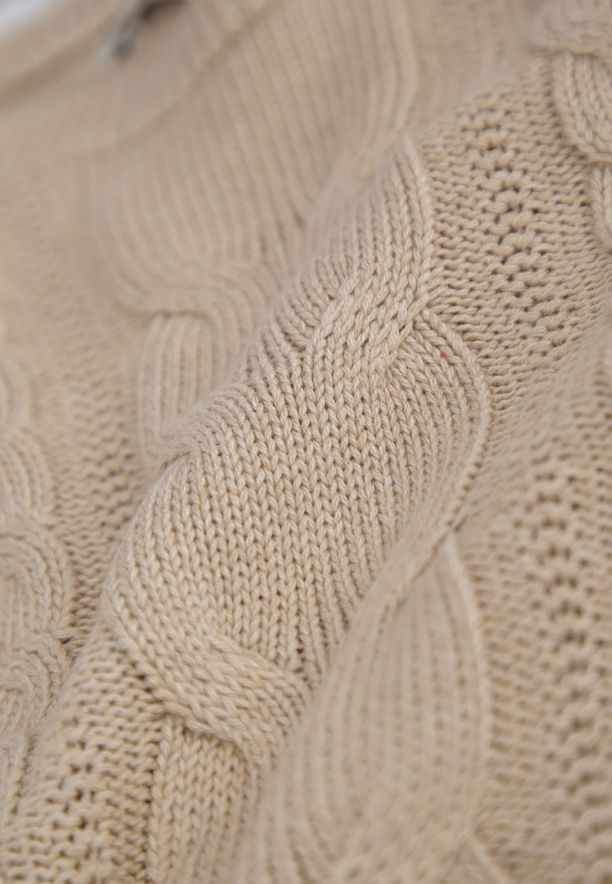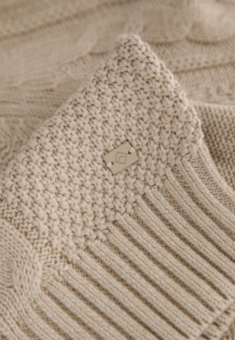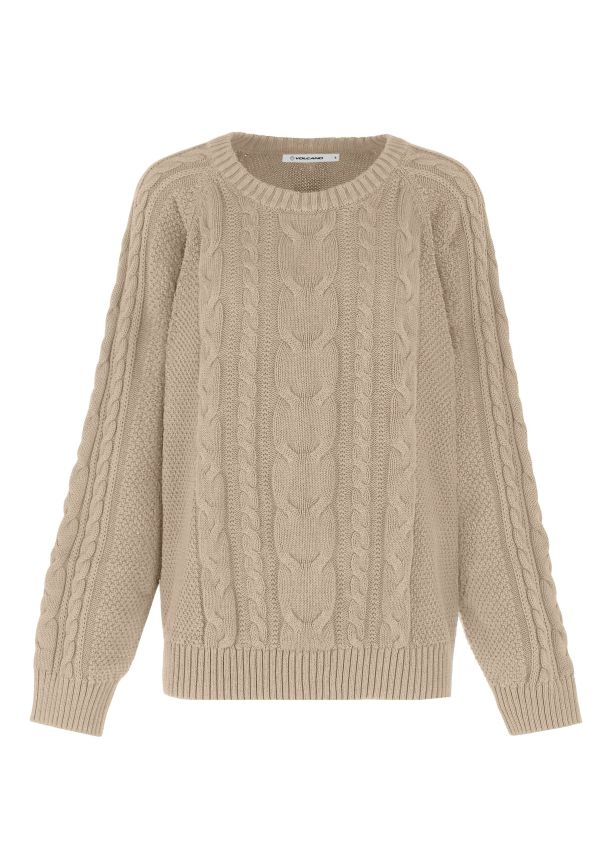 Svetr S-AYA s ozdobnou, copánkovou vazbou je ušit ze 100% bavlny. Díky tomu příjemně obepíná tělo, nezpůsobuje podráždění a je příjemný na dotek a snadný na údržbu. Zmíněná vazba dominuje na celé ploše svetru, také na rukávech a vyniká různými stehy. Výrazná copánková vazba je nadčasový vzor, který dodává svetru eleganci a unikátní charakter. Různorodost tloušťky copánků vytváří dynamickou texturu.