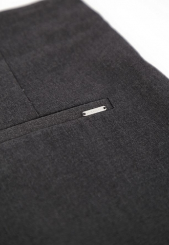 Grafitové látkové kalhoty mají širší pas a tvoří nedílnou součást konstrukce, což podtrhuje linii pasu. Jejich výjimečnost zdůrazňují dvě kovové, obdélníkové přezky, umístěné symetricky po stranách. Tyto minimalistické přezky plní ozdobnou funkci a dodávají kalhotám jedinečný, moderní charakter. Kombinace grafitovébarvy s moderními detaily činí kalhoty R-ISUMA ideální volbou jak pro kancelářské stylizace, tak pro elegantní soupravy pro speciální příležitosti, a také pro ležérnější, ale stále šik vzhled.