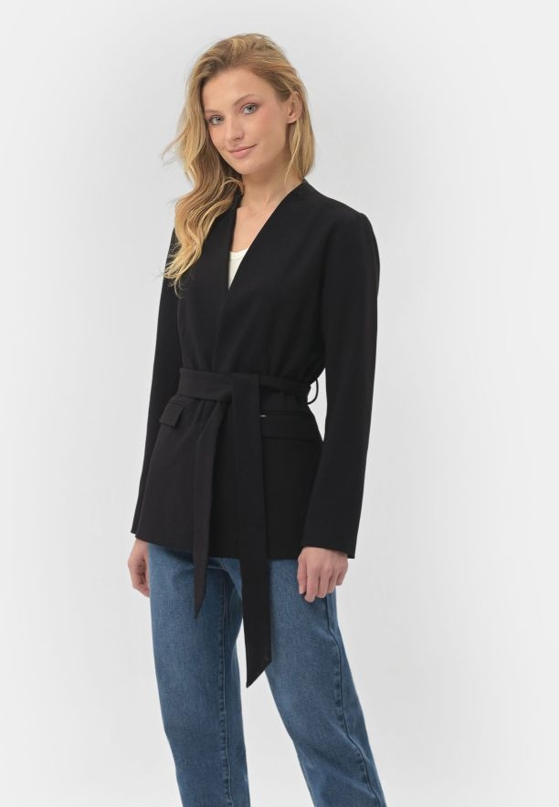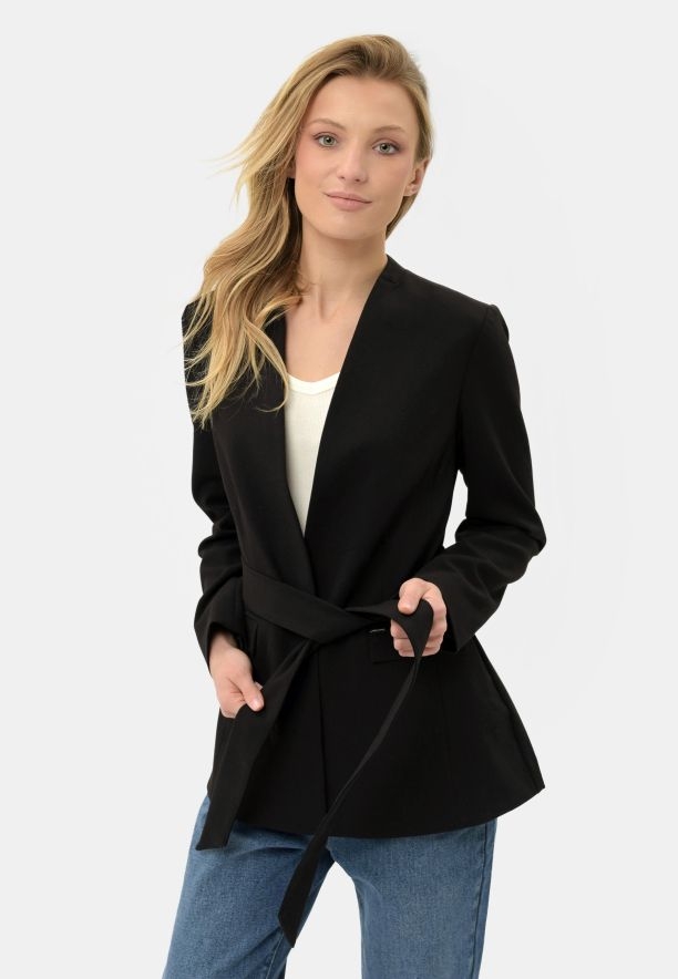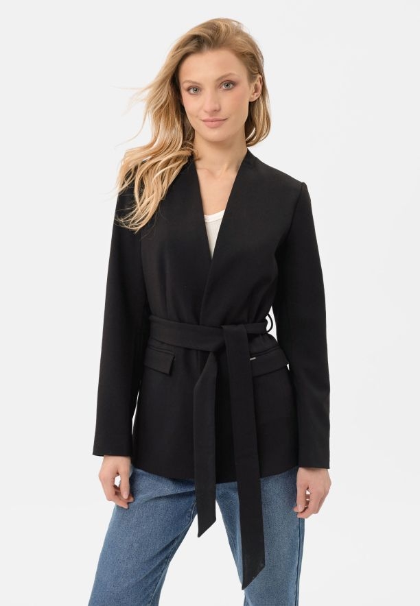 Toto černé sako je novinkou v naší nabídce! JB-MIRELLA je definicí minimalistické elegance a funkčnosti. Vyznačuje se moderním, otevřeným výstřihem bez límce a klop, což nejen opticky prodlužuje krk a zeštíhluje postavu, ale také zaručuje neomezenou volnost pohybu. Sako má jednoduchý a volný spodní lem a klasický, lehce přiléhavý střih. Vyrobeno z měkké, příjemné na dotek látky, dokonale se přizpůsobí tělu, zajišťujíc komfort po celý den. Přiložený pletený pásek je skutečnou předností – umožňuje zdůraznit pas, čímž dodává postavě ženské proporce a libovolně modeluje střih saka, od volného po více přiléhavý.