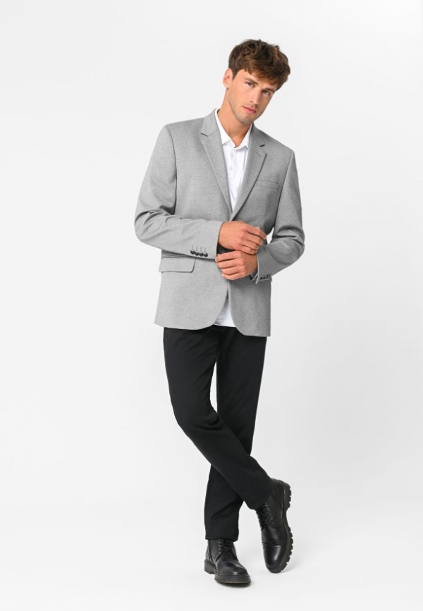 Grafitové pánské sako JB-RIZE je esence moderní elegance spojená s komfortem nošení. Jeho klasický střih se dvěma knoflíky v jedné řadě a otevřenými klopami se dokonale osvědčí v různorodých stylizacích, od kancelářských po casualové. Subtilní vazba látky mu dodává unikátní charakter, a detaily, jako imitace knoflíkové dírky a kapsičky na hrudi nebo patky u kapes dole, zdůrazňují jeho promyšlený design. Celek doplňuje ozdobná podšívka a dva boční rozparky vzadu ve formě skladů, zajišťující volnost pohybu a bezchybné uspořádání materiálu.