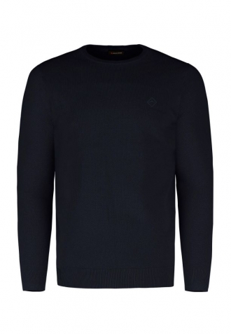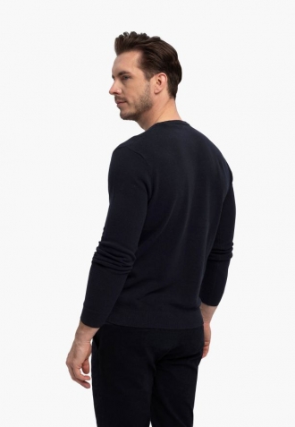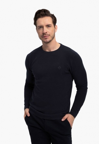 Casualový pánský svetr ideální pro každý den. Osvědčí se jako prvek stylizace do práce, tak i na setkání s přáteli nebo rodinný výlet. Takový je svetr se strukturou S-MIKO. Tento tmavě modrý svetr má klasický střih a výstřih typu crew neck, který díky lemování dobře sedí pod krkem. Ve svetru byly použity lemy také u rukávů, stejně jako na spodním lemu, což zabraňuje posouvání svetru na postavě.