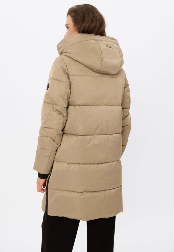 Tento dámský zimní kabát je ideální volbou pro chladné dny. Díky výplni z polyesterových vláken dokonale izoluje teplo a zajišťuje komfort i při velmi nízkých teplotách. Prošívaný kabát má praktickou kapuci s možností regulace a vysoký límec, který účinně chrání před větrem a sněhem. Dodatečné vybavení, jako jsou dvě kapsy na zip a elastické manžety, zvyšují pohodlí každodenního používání. Střední délka kabátu zajišťuje optimální ochranu před chladem, aniž by omezovala volnost pohybu.