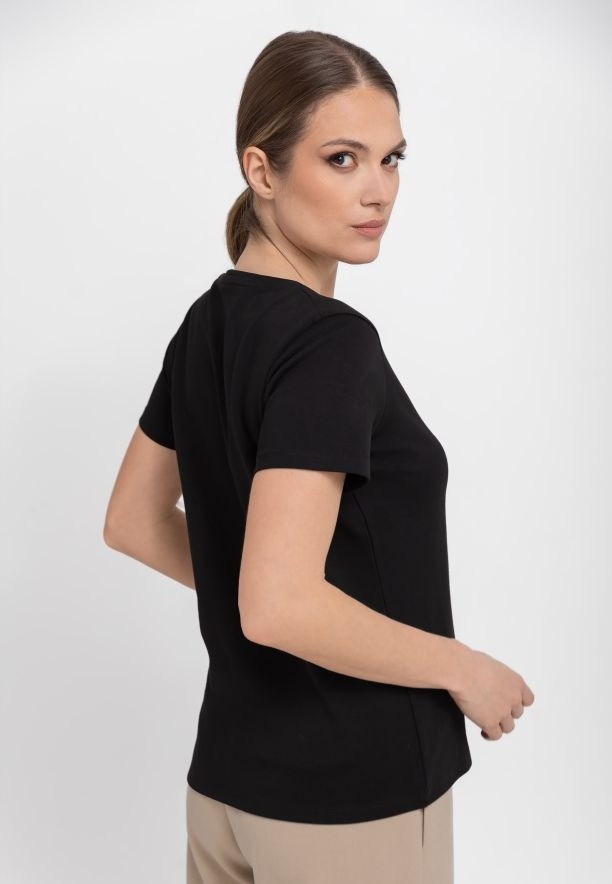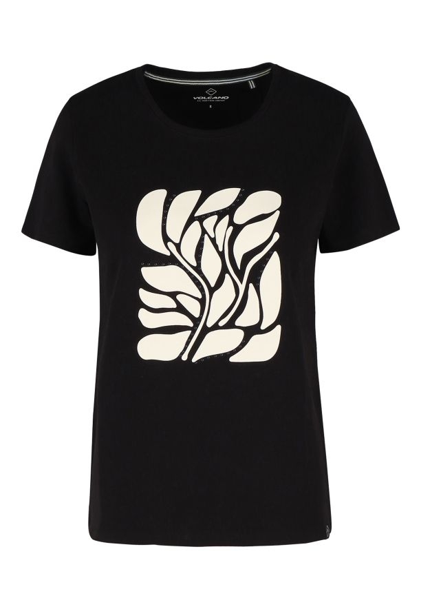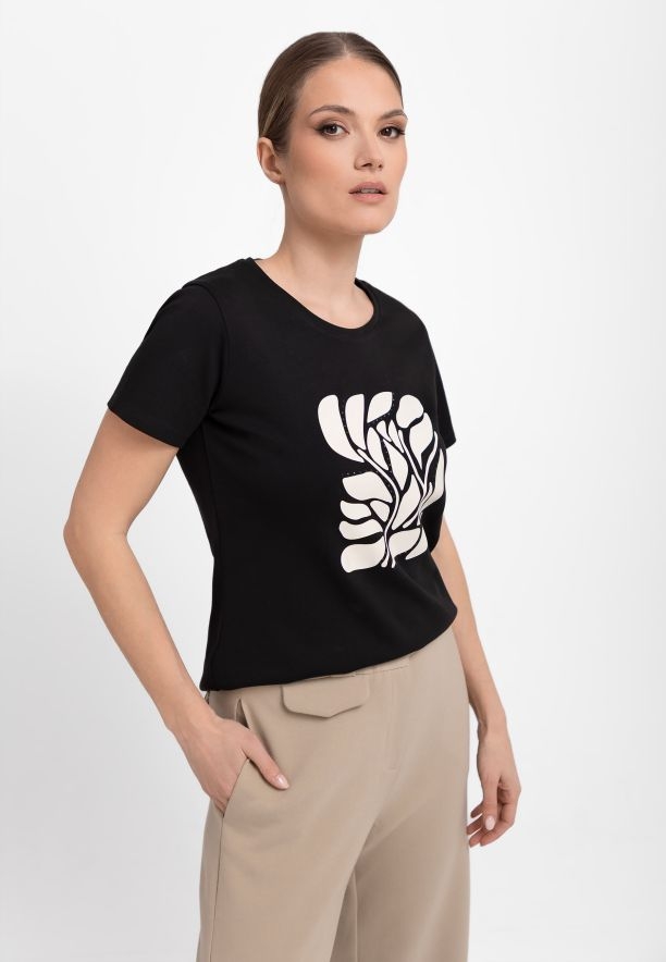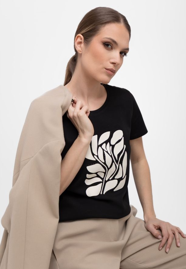 Dámské tričko v černé barvě má klasický střih a výrazný styl. Pozornost si zaslouží dekorativní potisk s rostlinným motivem v centrální části trička. Kontrastní bílá na černém pozadí přitahuje zrak a dodává celku originální, moderní charakter. Je to ideální volba pro ženy, které mají rády klasiku s uměleckým akcentem a cení si pohodlí ve stylovém provedení.