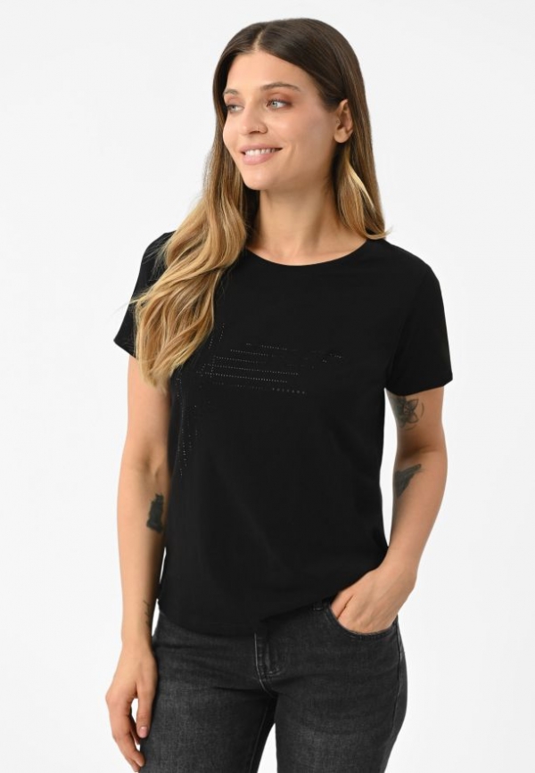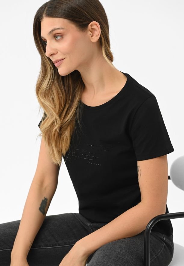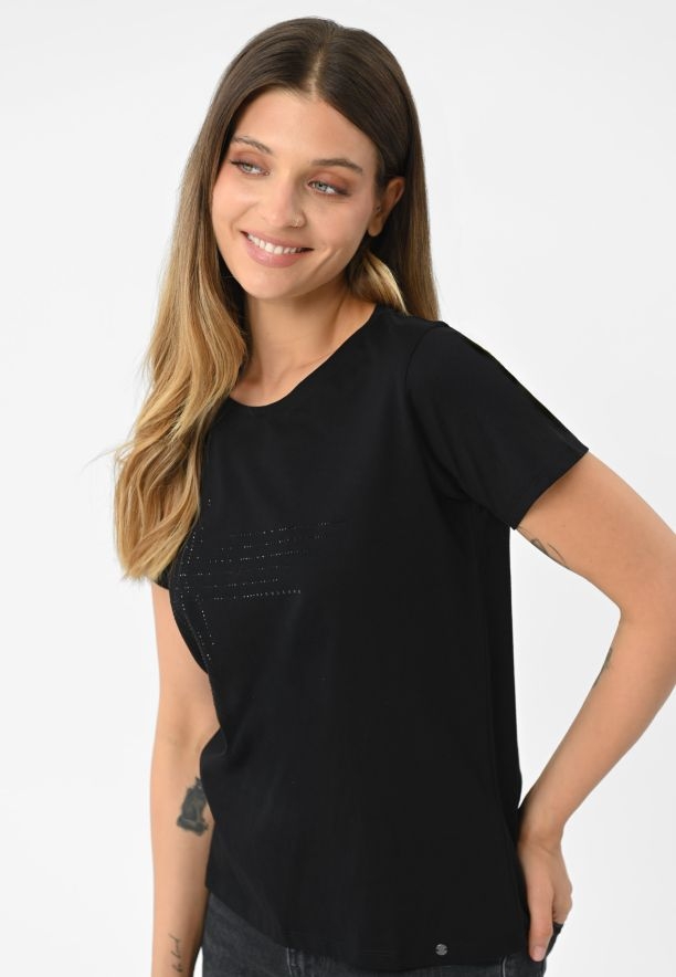 Minimalistický vzor z drobných kamínků/krystalků uspořádaných do geometrického vzoru dodává celku moderní akcent, aniž by dominoval celkovému vzhledu. Tričko se skvěle hodí k džínům, šortkám nebo pod sako, čímž tvoří univerzální prvek šatníku. Je to ideální volba pro ženy, které si cení pohodlí a decentního stylu pro každý den.