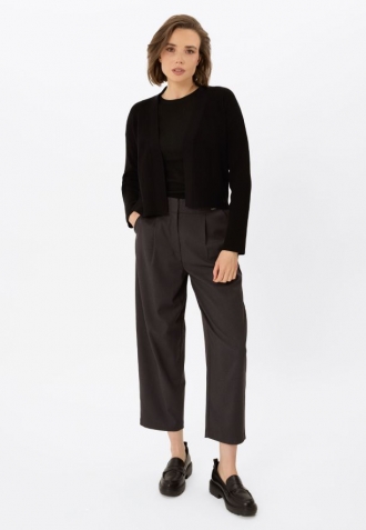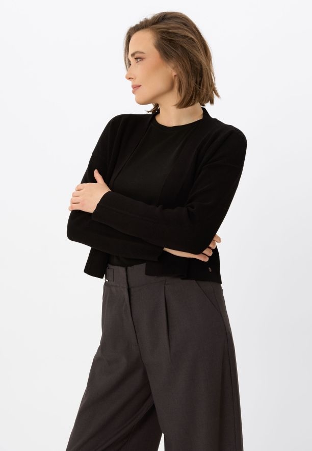 Svetr S-MIGA v černé barvě je krátký a bez zapínání. Ušitý z 80 % viskózy zajišťuje prodyšnost a vzdušnost, což v kombinaci s volným střihem zaručuje komfort nošení. Navíc jeho volný střih se sníženou linií ramen také způsobuje, že rozepínací svetr krásně sedí na těle, zaručuje volnost pohybu a dodává lehkost celé stylizaci. Klasický výstřih do V, přecházející v otevřené přední díly, podtrhuje jeho univerzálnost a umožňuje různorodé kombinace.