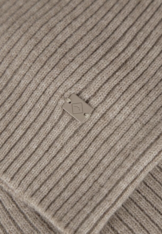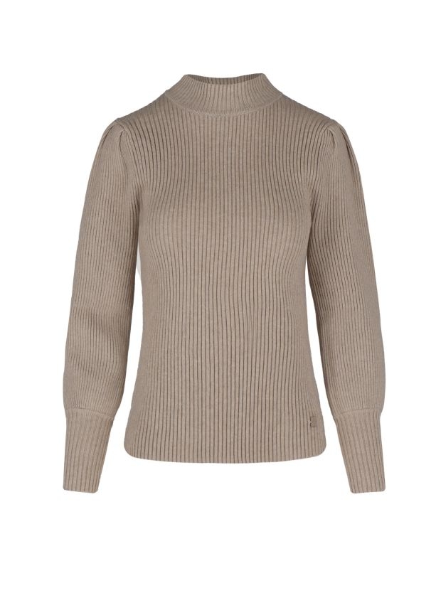 Svetr v béžové barvě má charakteristický žebrovaný vzor, který se táhne svisle, což opticky prodlužuje a jemně zvýrazňuje siluetu, dodávající jí štíhlost. Svetr se vyznačuje módními, nabíranými rukávy, které mu dodávají originalitu a lehce retro, a zároveň současný charakter. Polorolák obepíná krk, zajišťuje pohodlí a teplo. Díky svému střihu a ideálnímu přizpůsobení postavě svetr dokonale zvýrazňuje ženské tvary, zároveň zajišťuje volnost pohybu.